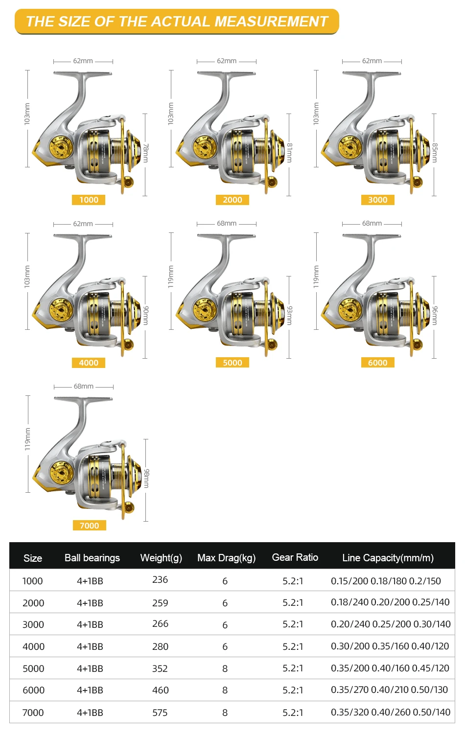 MEREDITH Fishing Spinning Reel Metal Spool 5.2:1 4+1BB Ball Bearings Carp Fishing Reel 1000-7000 Metal Line Cup Sea Tackle